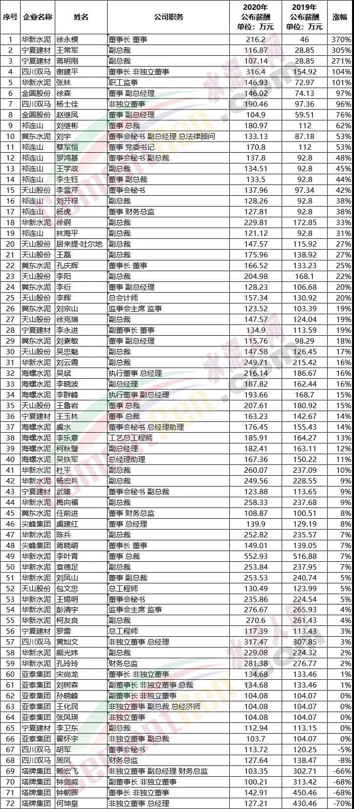 水泥企業(yè)上市公司73位高管中薪酬同比漲幅最高的是華新水泥的董事長徐永模,目前年薪為216.2萬元,同比上漲370%。年薪最高的是總裁李葉青,2020年3季度公布其年薪為552.93萬元,同比上漲7%。華新水泥16位高管年薪均在百萬元以上。其中15位年薪在200萬以上,一位年薪在100萬以上。塔牌水泥四位高管年薪降至100萬元左右,同比降幅66~70%。
