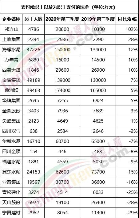 根據(jù)相關數(shù)據(jù)顯示,19家公司中有10家企業(yè)員工工資上漲,而有9家企業(yè)員工工資出現(xiàn)了下降。其中祁連山水泥職工薪酬同比漲幅超102%,上峰水泥薪酬同比上漲28%。