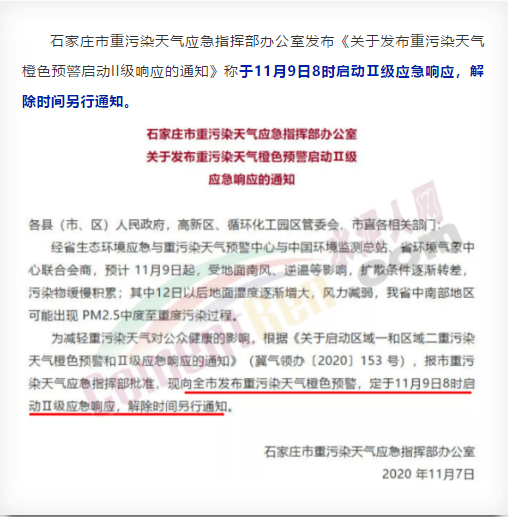 石家莊市11月9日8時啟動Ⅱ級應急響應,解除時間另行通知