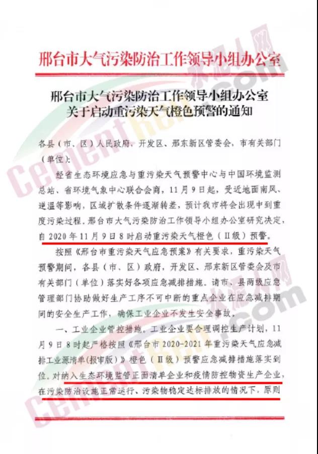 邯鄲市重污染天氣應急指揮部通知,于11月9日8時起啟動Ⅱ級應急響應,在確保安全生產(chǎn)的前提下,全市域嚴格按照應急減排有關要求落實各項應急減排措施。工業(yè)企業(yè)合理調(diào)控生產(chǎn)計劃,在確保安全生產(chǎn)和民生保障的前提下,按照《邯鄲市2020-2021年重污染天氣應急減排工業(yè)源清單(修訂版)》橙色預警(Ⅱ級)差異化減排措施執(zhí)行到位。