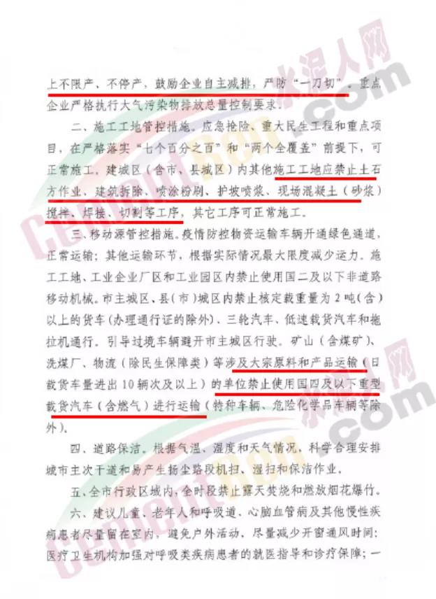 除應急搶險施工外,原則上,施工工地停止土石方、建筑拆除、噴涂粉刷等作業(yè)。礦山、砂石料廠、石材廠、石板廠等停止露天作業(yè)。