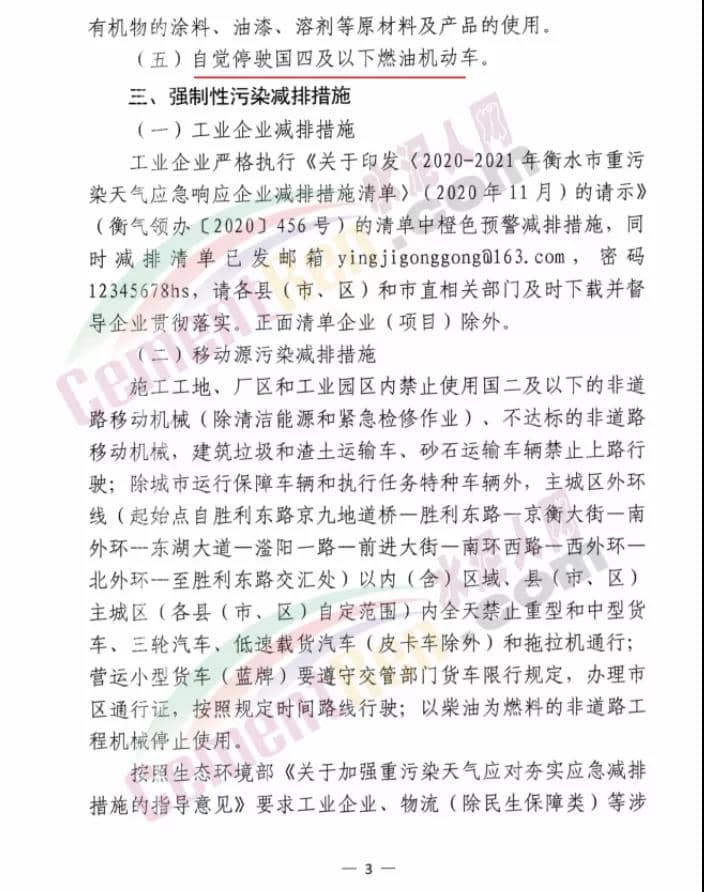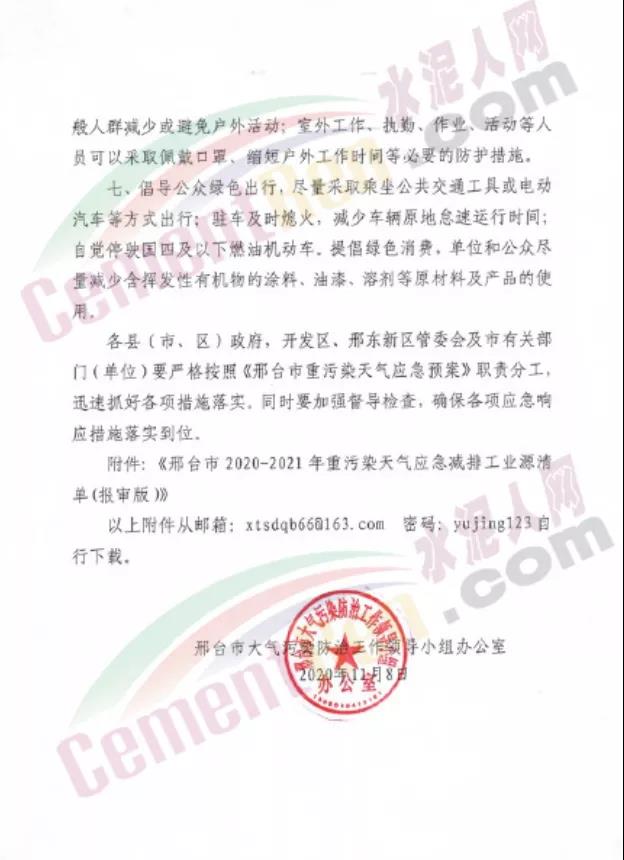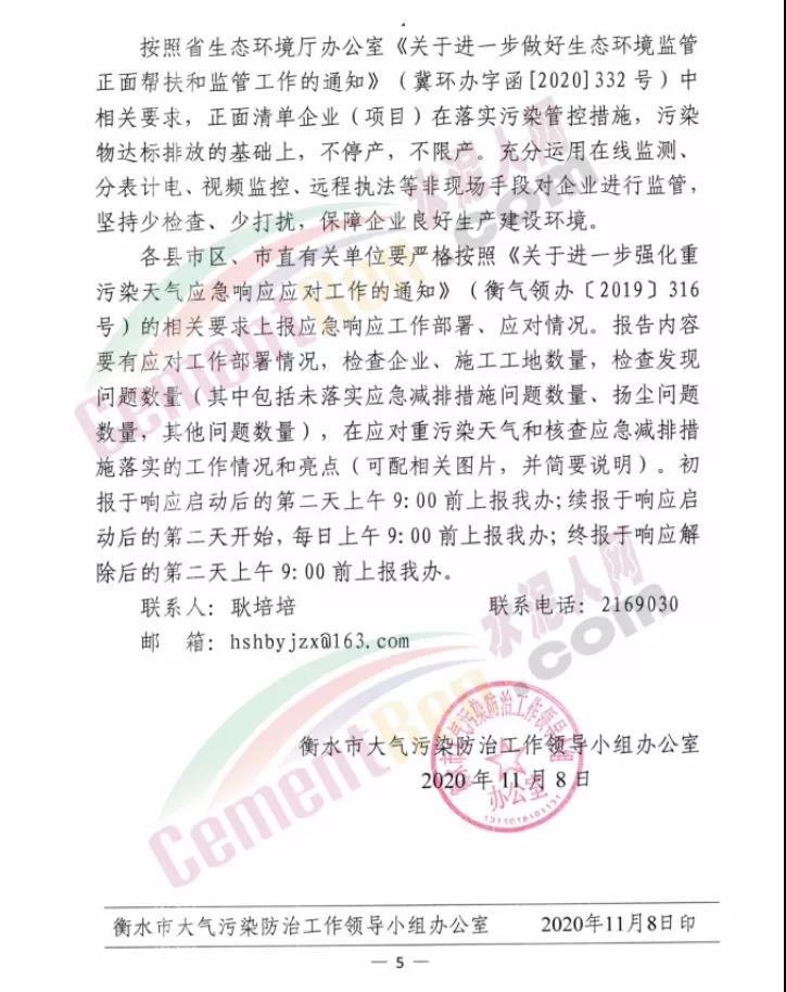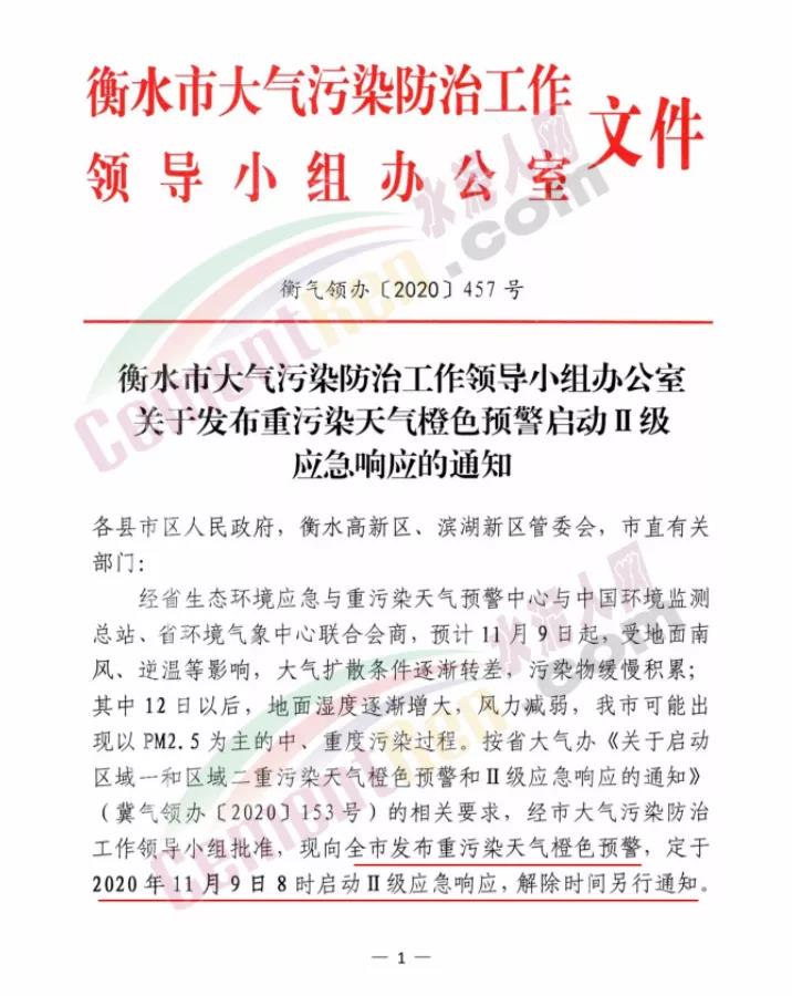 衡水市大氣污染防治工作領導小組辦公室發(fā)文:定于2020年11月9日8時啟動Ⅱ級應急響應,解除時間另行通知。工業(yè)企業(yè)嚴格按照《2020-2021年衡水市工業(yè)企業(yè)應急減排清單(報審版)》的清單中橙色預警減排措施執(zhí)行。除應急搶險外,建成區(qū)停止所有施工工地的土石方作業(yè)(包括:停止土石方開挖、回填、場內(nèi)倒運、摻拌石灰、混凝土剔鑿、改造、建筑工程配套道路和管溝開挖等作業(yè))、建筑拆除、噴涂粉刷、護坡噴漿、混凝土攪拌等。