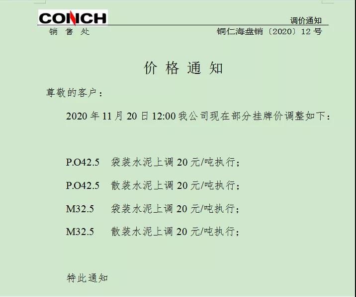 11月21日起重慶區(qū)域西南、海螺、東方希望等部分主要廠家對萬州、云陽等庫區(qū)一些市場高標(biāo)水泥價格通知上調(diào)30元/噸。貴州銅仁海螺通知自20日12時起上調(diào)各標(biāo)號水泥價格20元/噸。