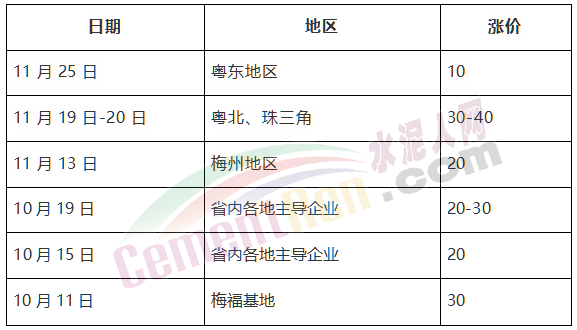 廣東省在11月份全區(qū)域普遍上調(diào)10~40元/噸,部分廠家對P.C42.5水泥價格上調(diào)50元/噸;10月普漲20~30元/噸,熟料上調(diào)10元/噸。下半年以來兩輪累計上調(diào)30~70元/噸。