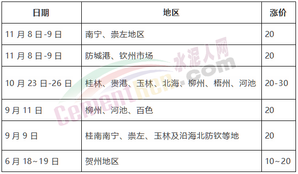 廣西區(qū)域下半年以來,分別在6中下旬,9月中旬,10月下旬及11月中旬前后四次上調(diào)水泥價格,累計上調(diào)達(dá)90元/噸。極個別企業(yè)累計上調(diào)100元/噸以上。