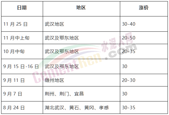 湖北地區(qū)武漢及鄂東地區(qū)分別在11月中上旬,11月下旬,10月中旬及9月中上旬、8月下旬分5次上調(diào)水泥價格,累計上調(diào)180元/噸。單位:元/噸