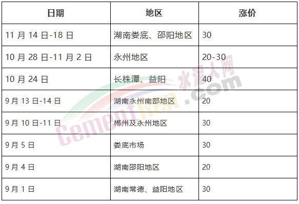 下半年以來,湖南地區(qū)分別在11月中下旬,10月下旬及9月份中上旬分三輪上調(diào)水泥價格,累計上調(diào)達(dá)100元/噸。