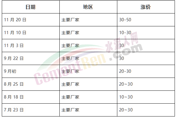 下半年以來安徽地區(qū)分別于8月份上旬、中旬、下旬;9月上旬、中下旬;以及11月上旬和中旬七次上調(diào),累計上調(diào)達(dá)200~260元/噸。