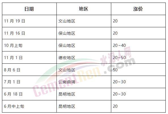 云南兩輪累計上調(diào)50~70元/噸云南省內(nèi)各區(qū)域普遍上調(diào)兩輪,其中文山地區(qū)因淡季價格下滑嚴(yán)重,分別于8上旬和11月中下旬上調(diào)水泥價格累計上調(diào)50~70元/噸。其他區(qū)域普調(diào)40~50元/噸。