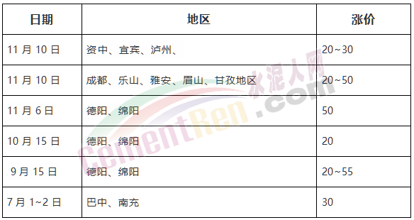 四川區(qū)域以德綿區(qū)域為主,自下半年以來已經(jīng)連續(xù)三次上調(diào)水泥價格累計上調(diào)90~125元/噸。