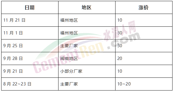 下半年以來福建地區(qū)分別在八月、九月及十一月中下旬上調(diào)水泥價格,三輪累計上漲60元/噸。