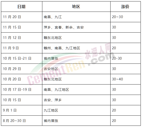 江西四輪連續(xù)上調(diào)120-130元/噸江西地區(qū)下半年以來從8月下旬開始調(diào)漲,分別在8月下旬至9月初、10月中正旬、11月初以及11月中下旬分四輪上調(diào)水泥價格,累計上調(diào)120~130元/噸。