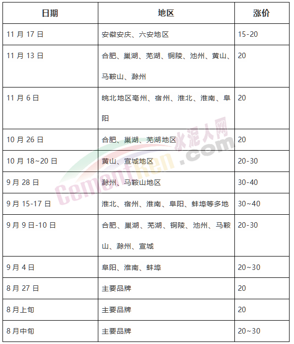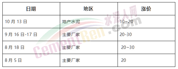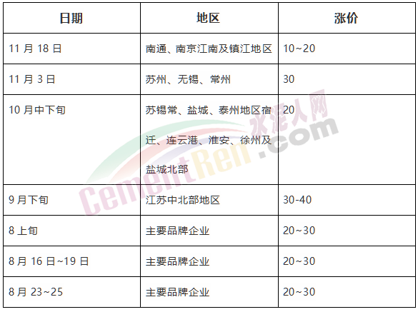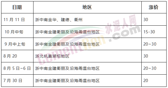 浙江省以上海周邊地區(qū)為主,下半年以來分別在7月下旬,8月上旬、下旬,9月中上旬以及10月中旬和11月中旬分六次上調(diào)水泥價格,累計上調(diào)135~170元/噸。