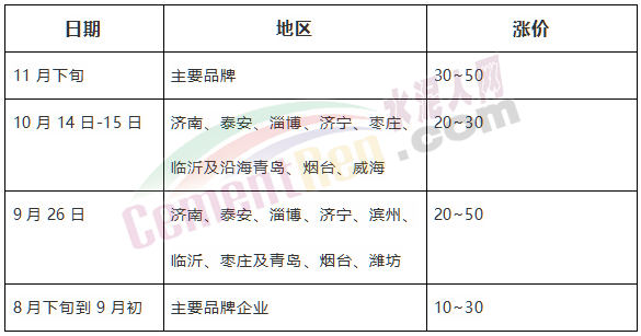 山東四次上調(diào),累計上調(diào)80~160元/噸
