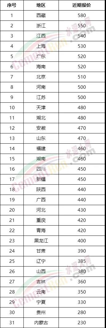 截止目前,最高價仍在西藏,浙江區(qū)域出廠均價達(dá)到550元/噸。最低價仍在內(nèi)蒙古地區(qū),最低均價達(dá)到230元/噸以下。