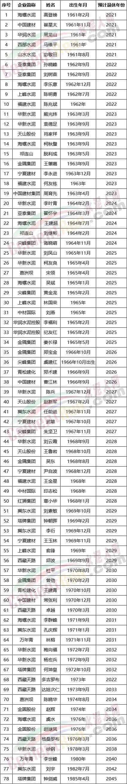 據(jù)水泥人網(wǎng)不完全統(tǒng)計(jì)78位上市企業(yè)高管中有34位將于5年內(nèi)到退休年齡。其中海螺水泥總工李樂(lè)意2022年到退休年齡,祁連山水泥董事長(zhǎng)脫利成、華新水泥南部事業(yè)部總裁熊光煒、湖北西部事業(yè)部總裁袁德足、天山股份肖家祥、海螺水泥柯秋璧2023年到退休年齡, 華新水泥總裁李葉青、尖峰集團(tuán)董事長(zhǎng)蔣曉萌、海螺水泥副董事長(zhǎng)王建超、亞泰集團(tuán)翟懷宇、祁連山水泥總裁劉繼彬2024年到退休年齡... ...
