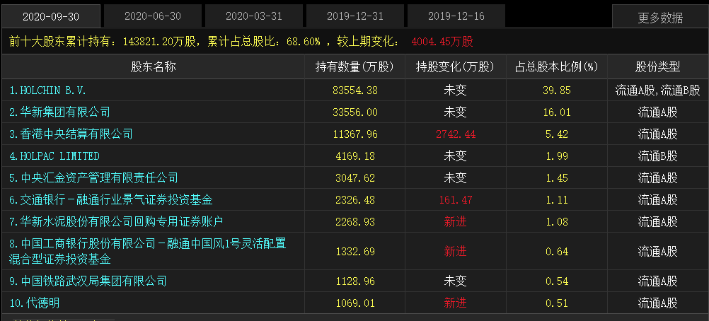 連日來,市場盛傳華新水泥的第一大股東國際水泥巨頭HOLCHIN B.V要將持有華新水泥39.85%的股權出讓。同時有消息稱,作為國內最賺錢的水泥企業(yè),海螺水泥有意收購拉法基豪瑞持有的華新水泥39.85%的股權,如果此事屬實,那將對國內水泥行業(yè)的發(fā)展格局產生重大的影響。從華新水泥上市公司前十大股東結構來看,國際水泥巨頭HOLCHIN B.V持83554.38萬股,占總股本比例達到39.85%,按照目前華新水泥股票市值(23.60元/股)計算,這部分股份總資產達到197.19億。