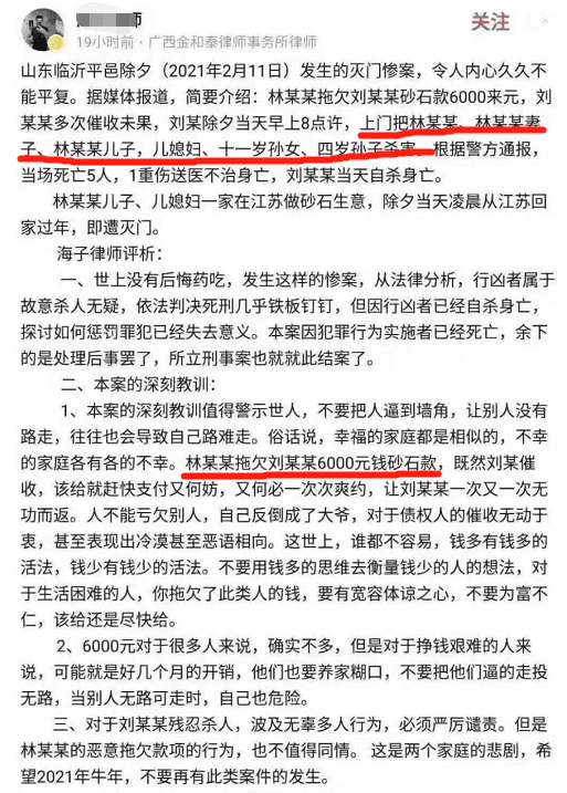 在評(píng)論區(qū)有知情人透露,這樣一起惡性案件源于6000元的要賬,死者一家分別是年逾五旬的夫婦、兒子兒媳,孫子孫女,相當(dāng)于一家6口滅門。犯罪嫌疑人自己也已經(jīng)自殺身亡。