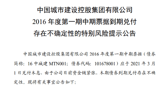 日前,中國城市建設(shè)控股集團(tuán)有限公司(簡稱“中城建”)發(fā)布提示公告,“16中城建MTN001”債券于2021年3月1日到期,因資金鏈緊張存在不能兌付的可能性,而從發(fā)行之日起,該筆債權(quán)幾乎從未按時(shí)兌付,已構(gòu)成多次實(shí)質(zhì)性違約,此次違約將大概率出現(xiàn)。債權(quán)人稱中城建名下已無資產(chǎn),而多年來中城建遍尋合作方未果。