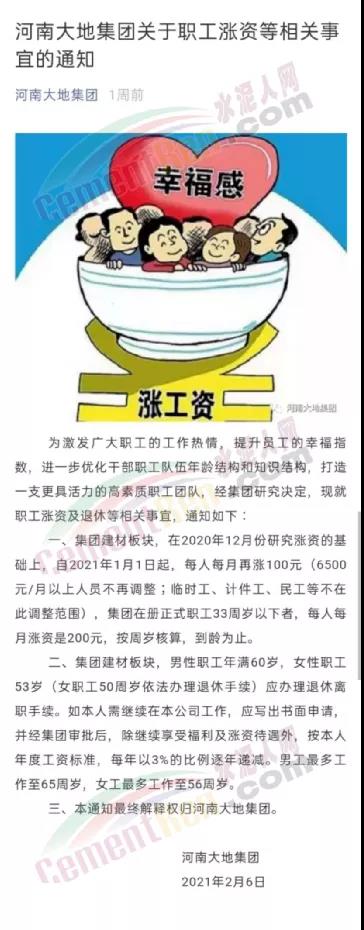 前不久,河南大地集團發(fā)布了一則漲薪通知,提出在2020年12月份研究漲資的基礎上,自2021年1月1日起,每人每月再漲100元,集團在冊正式職工33周歲以下者,每人每月漲資是200元。