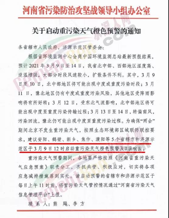 河南省污染防治攻堅戰(zhàn)領導小組辦公室發(fā)布《關于啟動重污染天氣橙色預警的通知》提到,按照生態(tài)環(huán)境部區(qū)域聯(lián)防聯(lián)控要求建議河南省安陽、鶴壁、新鄉(xiāng)、焦作、濮陽等5個省轄市和濟源示范區(qū)于3月9日12時啟動重污染天氣橙色預警及Ⅱ級響應。