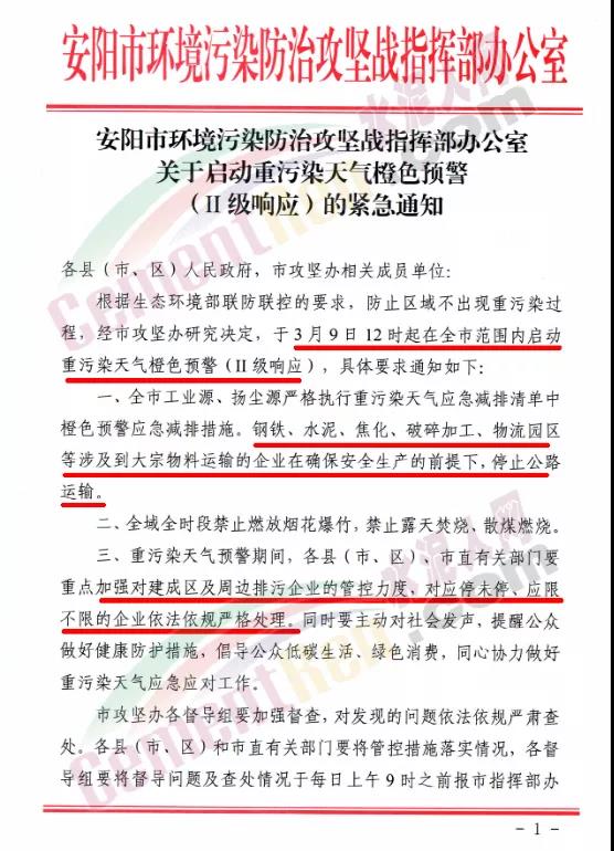 安陽市環(huán)境污染防治攻堅戰(zhàn)指揮部辦公室發(fā)布《關于啟動重污染天氣橙色預警(Ⅱ級響應)的緊急通知》,要求于3月9日12時在全市范圍內啟動重污染天氣橙色預警(Ⅱ級響應)要求全市工業(yè)源、揚塵源嚴格執(zhí)行重污染天氣應急減排清單中橙色預警應急減排措施。