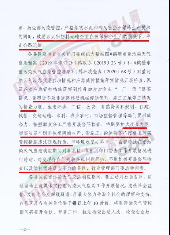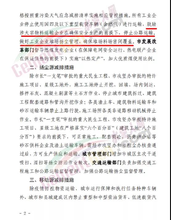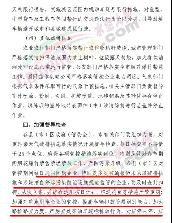 鋼鐵、水泥、焦化、破碎加工、物流園區(qū)等涉及到大宗物料運輸?shù)钠髽I(yè)在確保安全生產的前提下,停止公路運輸。重污染天氣預警期間,各縣(市、區(qū))、市直有關部門要重點加強對建成區(qū)及周邊排污企業(yè)的管控力度,對應停未停、應限不限的企業(yè)依法依規(guī)嚴格處理。
