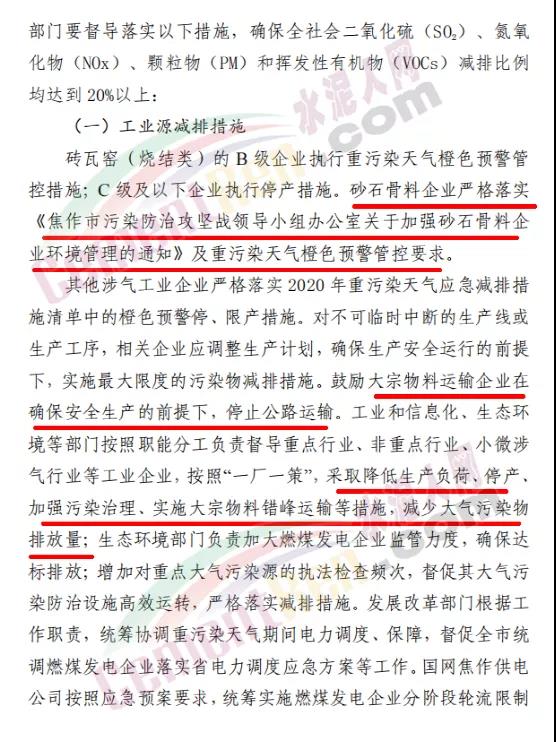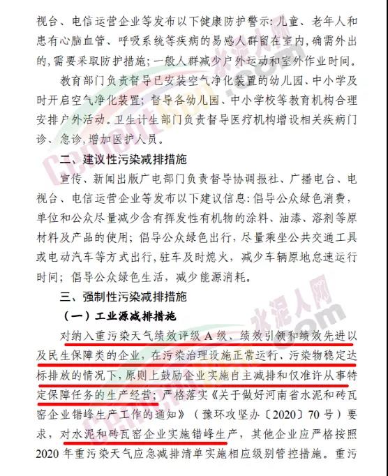 工業(yè)源減排措施要求對納入重污染天氣績效評級A級、績效引領和績效先進以及民生保障類的企業(yè),在污染治理設施正常運行、污染物穩(wěn)定達標排放的情況下,原則上鼓勵企業(yè)實施自主減排和僅準許從事特定保障任務的生產經營;嚴格落實《關于做好河南省水泥和磚瓦窯企業(yè)錯峰生產工作的通知》(豫環(huán)攻堅辦〔2020〕70號)要求,對水泥和磚瓦窯企業(yè)實施錯峰生產,其他企業(yè)應嚴格按照2020年重污染天氣應急減排清單實施相應級別管控措施。