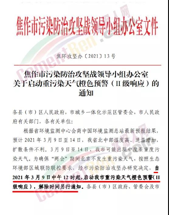 焦件市污染防治攻堅戰(zhàn)領導小組辦公室文件發(fā)布《焦作市污染防治攻堅戰(zhàn)領導小組辦公室關于啟動重污染天氣橙色預警(Ⅱ級響應)的通知》稱自2021年3月9日中午12時起,啟動焦作市重污染天氣橙色預警(Ⅱ級響應),解除時間另行通知。
