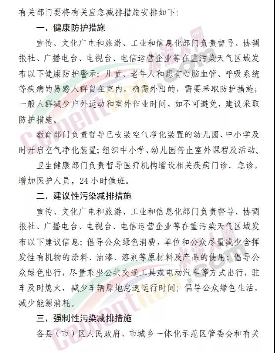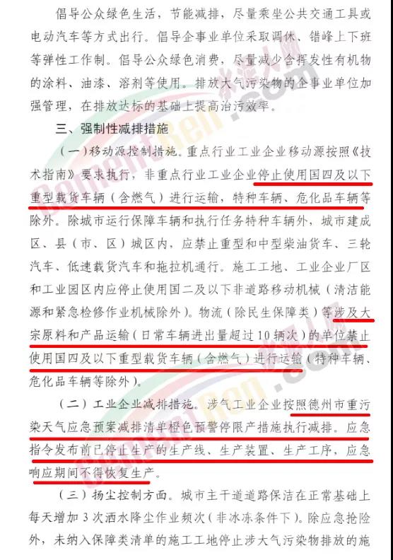 工業(yè)企業(yè)減排措施。涉氣工業(yè)企業(yè)按照德州市重污染天氣應急預案減排清單橙色預警停限產措施執(zhí)行減排。應急指令發(fā)布前已停止生產的生產線、生產裝置、生產工序,應急響應期間不得恢復生產。