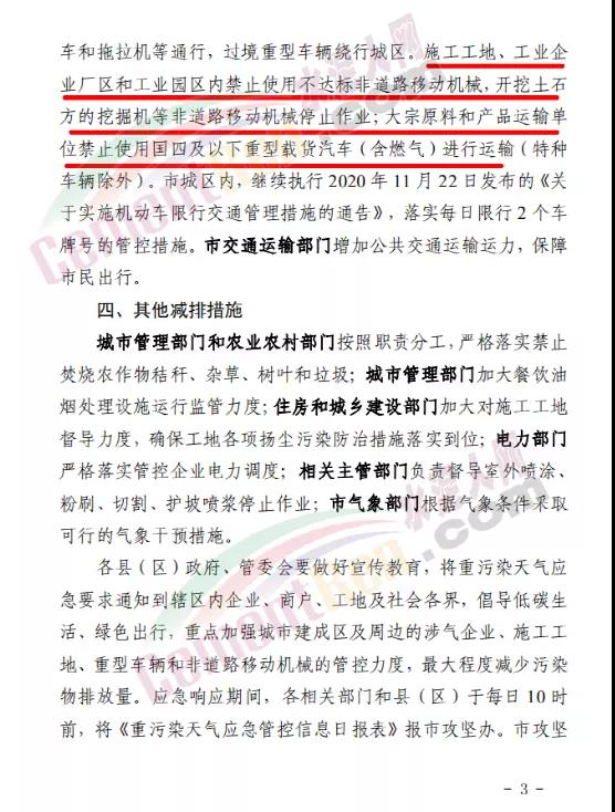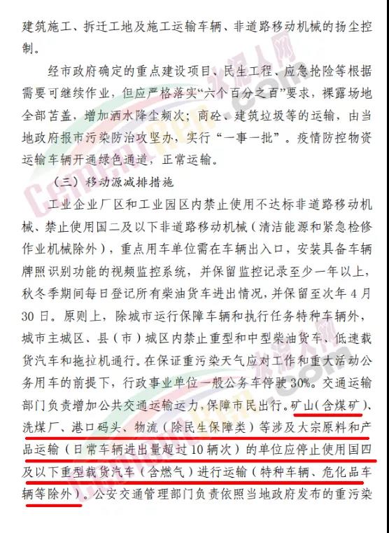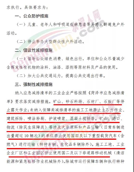 強制性減排措施要求納入應急減排清單的工業(yè)企業(yè)嚴格按照《菏澤市應急減排清單》要求落實減排措施。礦山、砂石料場、石材廠、石板廠等停止露天作業(yè);未納入保障類減排清單的施工工地禁止土石方作業(yè)、建筑拆除、噴涂粉刷、護坡噴漿、混凝土攪拌等。礦山、港口、物流(除民生保障類)等涉及大宗原料和產品運輸(的單位禁止使用國四及以下重型載貨汽車進行運輸。施工工地、工業(yè)企業(yè)廠區(qū)和工業(yè)園區(qū)停止使用國二及以下非道路移動機械。