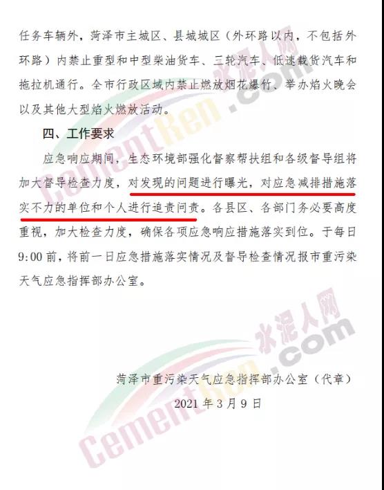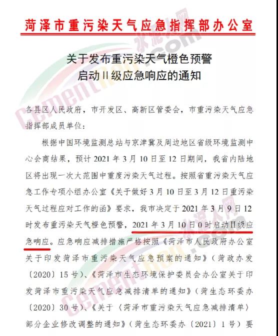 山東省菏澤市重污染天氣應急指揮部辦公室發(fā)布《關于發(fā)布重污染天氣橙色預警啟動Ⅱ級應急響應的通知》稱于2021年3月9日12時發(fā)布重污染天氣橙色預警,2021年3月10日0時啟動Ⅱ級應急響應。