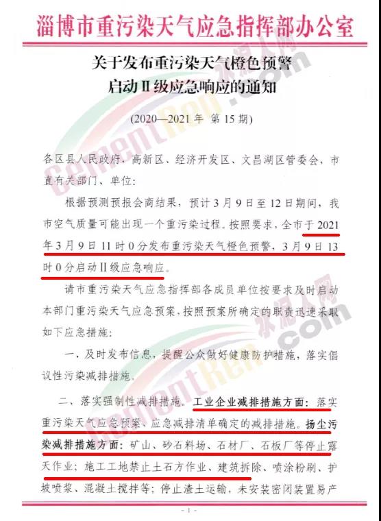 淄博市重污染天氣應急指揮部辦公室發(fā)布《關于發(fā)布重污染天氣橙色預警啟動Ⅱ級應急響應的通知》稱按照要求,全市于2021年3月9日11時0分發(fā)布重污染天氣橙色預警,3月9日13時0分啟動Ⅱ級應急響應。請市重污染天氣應急指揮部各成員單位按要求及時啟動本部門重污染天氣應急預案,按照預案所確定的職責迅速采取如下應急措施∶