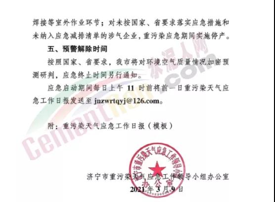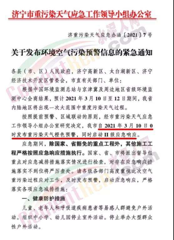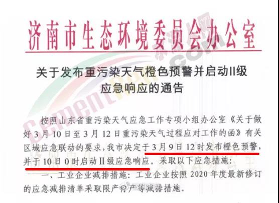 濟寧市自2021年3月10日0時發(fā)布重污染天氣橙色預警,同時啟動II級應急響應。