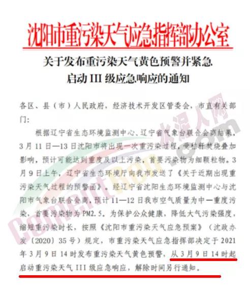 根據遼寧省生態(tài)環(huán)境廳《關于近期出現(xiàn)重污染天氣過程的預警函》提示,經遼寧省生態(tài)環(huán)境監(jiān)測中心、遼寧省氣象臺聯(lián)合會商,2021年3月11日-13日大氣擴散條件較為不利,受秸稈焚燒疊加影響,預計我市將出現(xiàn)一次重污染過程。經遼寧省沈陽生態(tài)環(huán)境監(jiān)測中心與沈陽市氣象臺聯(lián)合會商,預計11—12日我市空氣質量為中—重度污染,首要污染物為PM2.5。為了做好重污染天氣應對工作,保障公眾健康,按照《沈陽市重污染天氣應急預案》(沈政辦發(fā)〔2020〕35號)規(guī)定,市重污染天氣應急指揮部決定于3月9日14時發(fā)布重污染天氣黃色預警,并于14時緊急啟動Ⅲ級應急響應。
