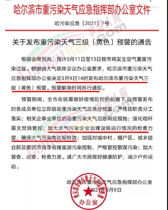 根據《哈爾濱市重污染天氣應急預案(2020年修訂)》規(guī)定,哈爾濱市重污染天氣應急指揮部辦公室決定3月9日14時發(fā)布哈爾濱市重污染天氣三級(黃色)預警。
