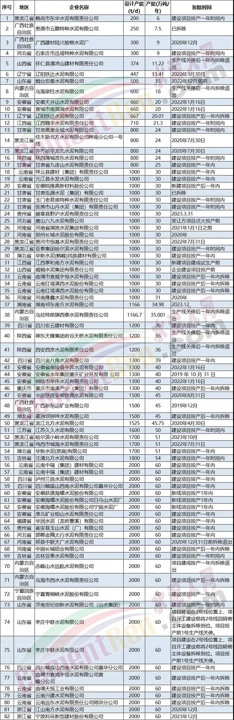 行業(yè)內(nèi)熟料產(chǎn)能、粉磨產(chǎn)能的置換退出公示公告也經(jīng)常出現(xiàn)在各區(qū)域工信系統(tǒng)的公開(kāi)欄。兩條、三條甚至四條五條線換一條新建線,置換比例也在逐年提高。