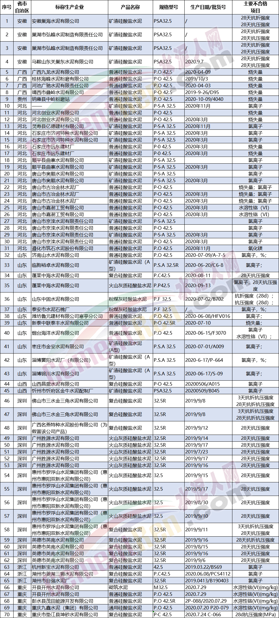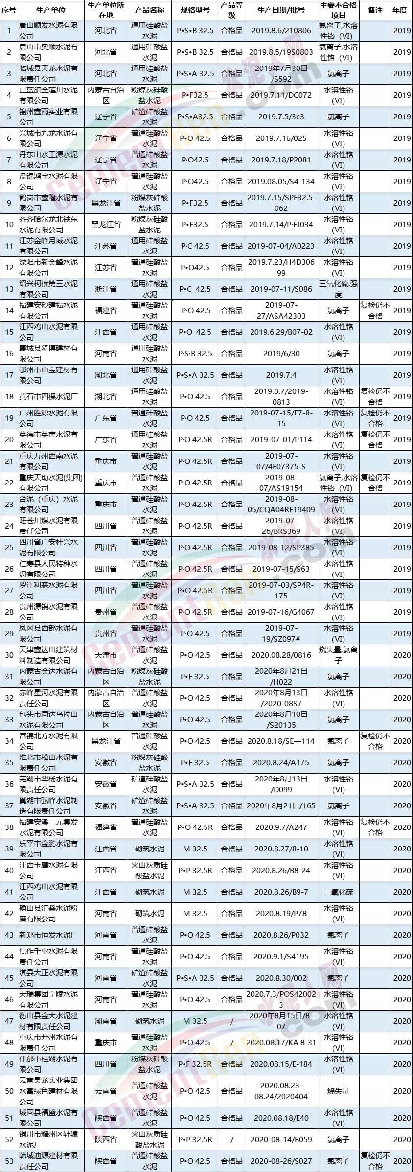 從近兩年多個(gè)省市自治區(qū)通報(bào)的不合格產(chǎn)品結(jié)果可見不僅包括部分企業(yè)生產(chǎn)的32.5等級標(biāo)號水泥也包括42.5等級的普遍硅酸鹽水泥。不合格項(xiàng)目不僅包括抗壓,抗折強(qiáng)度,氯離子,也包括水溶性鉻以及燒失量等多個(gè)項(xiàng)目,可見水泥質(zhì)量的問題與標(biāo)號無關(guān),極有可能與企業(yè)所用的材料以及生產(chǎn)工藝有關(guān)。