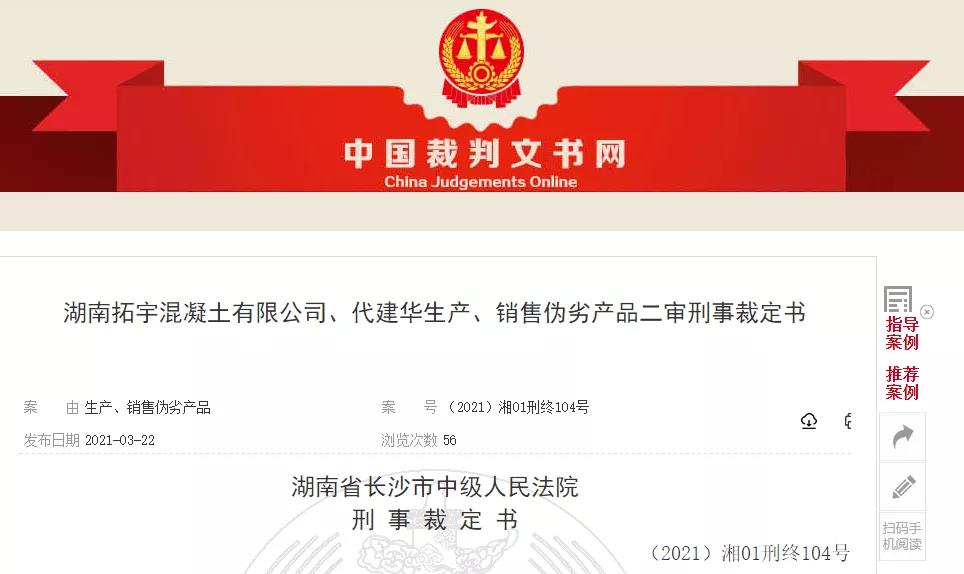 日前,湖南省長沙市中級(jí)人民法院對(duì)“湖南拓宇混凝土有限公司、代建華生產(chǎn)、銷售偽劣產(chǎn)品”案件作出二審刑事裁定。