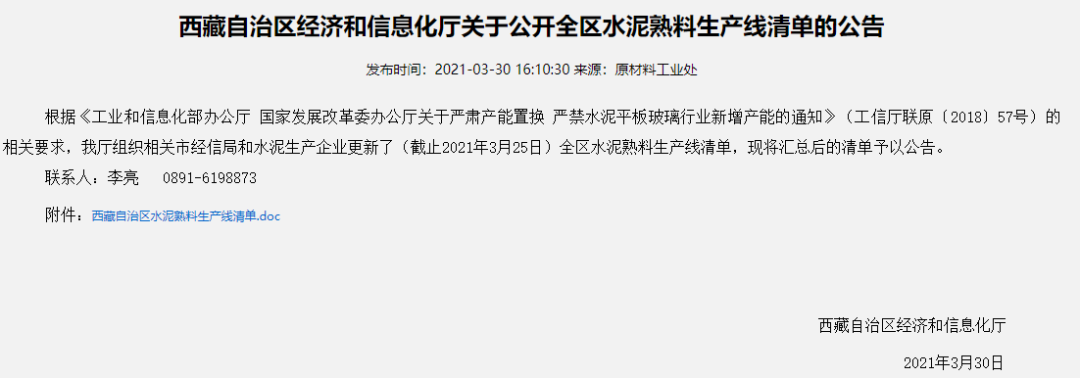 3月30日,西藏自治區(qū)經(jīng)濟(jì)和信息化廳發(fā)布《西藏自治區(qū)經(jīng)濟(jì)和信息化廳關(guān)于公開(kāi)全區(qū)水泥熟料生產(chǎn)線清單的公告》稱,根據(jù)相關(guān)文件要求,西藏自治區(qū)經(jīng)信廳組織相關(guān)市經(jīng)信局和水泥生產(chǎn)企業(yè)更新了全區(qū)水泥熟料生產(chǎn)線清單,并將匯總后的清單予以公告。