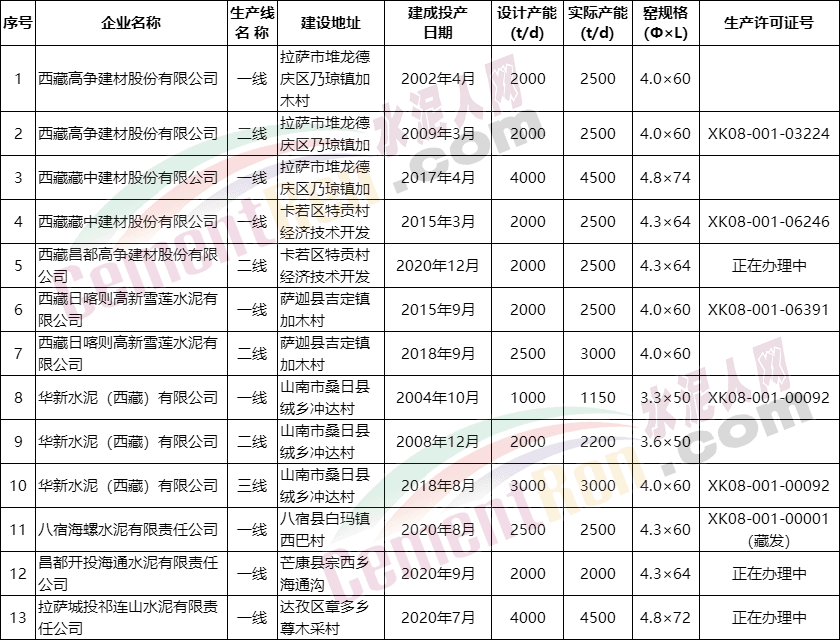 西藏自治區(qū)水泥熟料生產(chǎn)線清單顯示,包括西藏高爭(zhēng)、高新雪蓮、華新西藏、八宿海螺、昌都開(kāi)投海通以及拉薩城投祁連山水泥在內(nèi)的13條熟料生產(chǎn)線,實(shí)際年產(chǎn)能達(dá)千萬(wàn)噸以上。