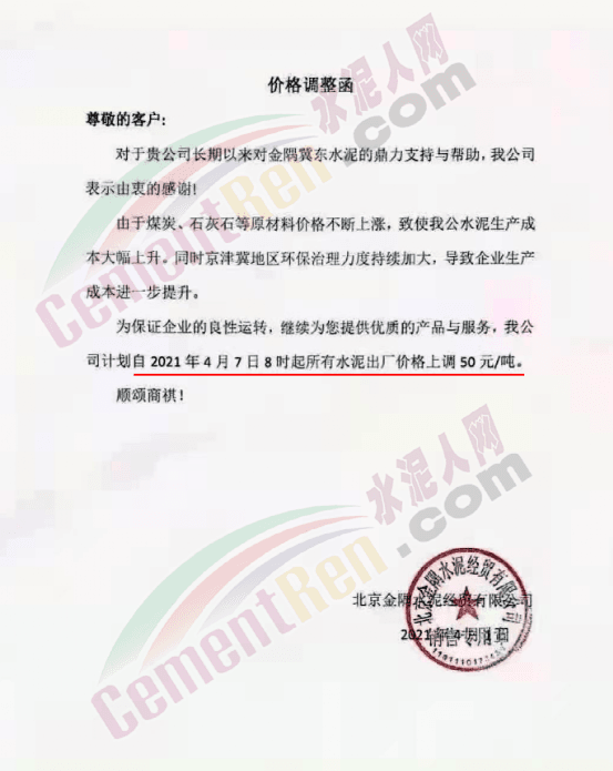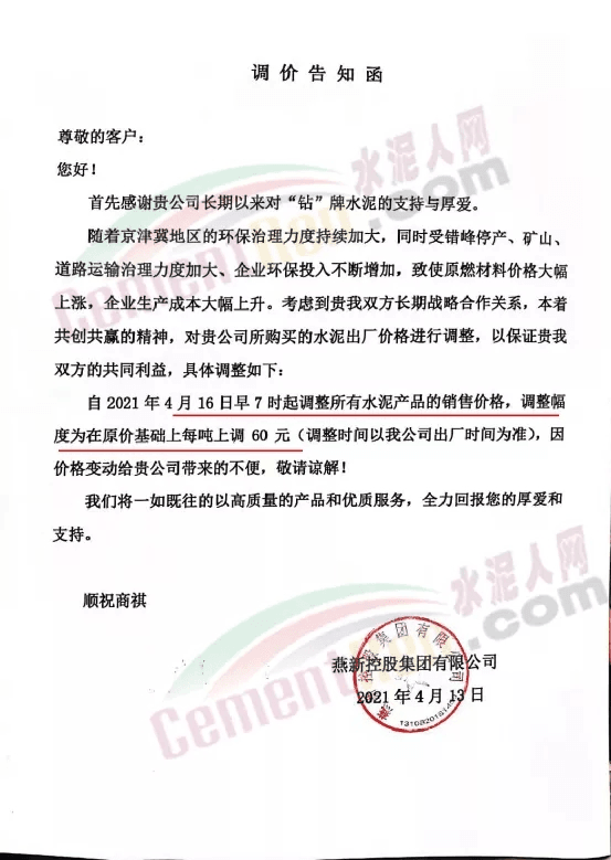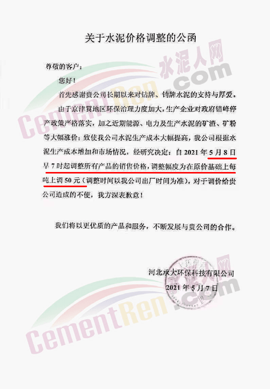 河北承大環(huán)??萍加邢薰就ㄖ河捎诰┙蚣降貐^(qū)環(huán)保治理力度加大,生產(chǎn)企業(yè)對政府錯峰停產(chǎn)政策嚴格落實,加之近期能源、電力及生產(chǎn)水泥的礦渣、礦粉等大幅漲價;致使公司水泥生產(chǎn)成本大幅提高,公司根據(jù)水泥生產(chǎn)成本增加和市場情況,經(jīng)研究決定,自2021年5月8日早7時起調(diào)整所有產(chǎn)品的銷售價格,調(diào)整幅度為在原價基礎(chǔ)上上調(diào)50元/噸。4月1日也曾上調(diào)50元/噸,兩次累計上調(diào)100元/噸。