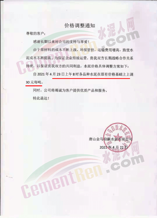 唐山金馬啟新水泥有限公司通知由于原材料的成本不斷上漲,環(huán)保管控,運輸費用增高,致使水泥成本不斷提高。自2021年5月10日上午8時各品種水泥在原有價格基礎(chǔ)上上調(diào)50元/噸。4月30日曾上調(diào)30元/噸,兩次累計上調(diào)80元/噸。