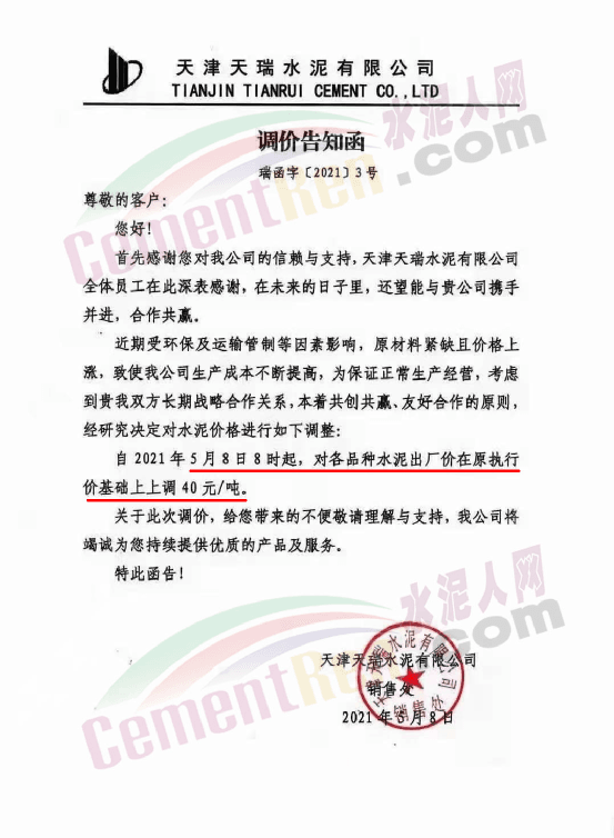 天津天瑞水泥有限公司通知,近期受環(huán)保及運輸管制等因素影響,原材料緊缺且價格上漲,致使公司生產(chǎn)成本不斷提高,為保證正常生產(chǎn)經(jīng)營,經(jīng)研究決定自2021年5月8日8時起,對各品種水泥出廠價在原執(zhí)行價基礎(chǔ)上上調(diào) 40元/噸。