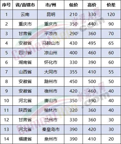 以PO42.5散裝水泥為例,從水泥人網(wǎng)信息中心重點監(jiān)控的十余個城市來看,重慶市,甘肅平?jīng)鍪?,安徽馬鞍山市、宿州市,四川涼山州,山西大同市,湖南懷化市等不同企業(yè)之間的價差均在50元/噸以上,其中價差最大的是云南省昆明市,最高報價和較低報價之間相差120元/噸。