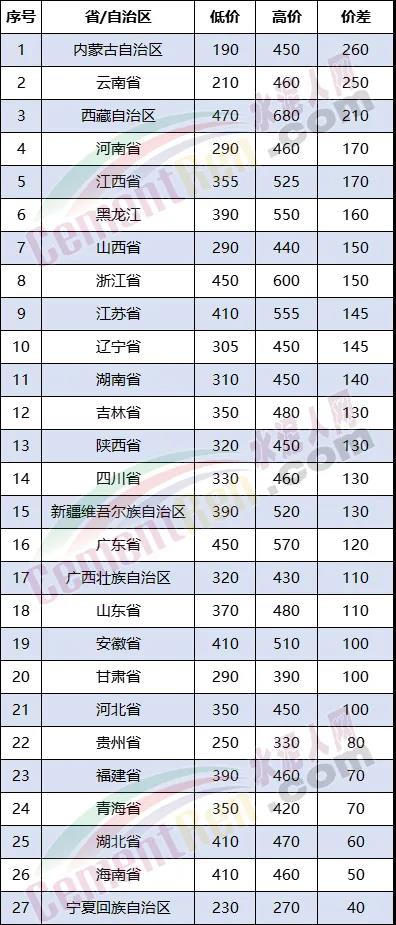 從各個省自治區(qū)不同企業(yè)報價差距來看,價差從40~260元/噸不等,其中內(nèi)蒙、西藏、云南、河南、江西、黑龍江、山西、浙江、江蘇等21個省、自治區(qū)價差均在100元/噸以上。