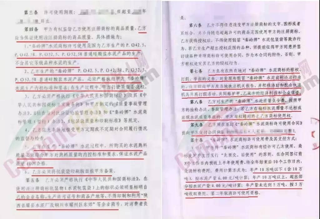據(jù)水泥人網(wǎng)了解,其品牌授權(quán)生產(chǎn)經(jīng)營(yíng)協(xié)議中有明確質(zhì)量及品牌使用要求。商標(biāo)使用者應(yīng)保證使用該注冊(cè)商標(biāo)的商品質(zhì)量,具體措施為,“秦嶺牌”水泥商標(biāo)許可使用范圍為商標(biāo)使用者生產(chǎn)的各標(biāo)號(hào)普通硅酸鹽水泥產(chǎn)品;商標(biāo)使用者生產(chǎn)的“秦嶺牌”各標(biāo)號(hào)水泥,必須嚴(yán)格執(zhí)行商標(biāo)使用者“秦嶺牌”水泥生產(chǎn)內(nèi)控標(biāo)準(zhǔn)和要求。在生產(chǎn)過程中,耀縣水泥廠行使質(zhì)量否決權(quán);商標(biāo)使用者在生產(chǎn)“秦嶺牌”水泥的過程中,所購(gòu)買的水泥熟料質(zhì)量必須符合耀縣水泥廠對(duì)熟料質(zhì)量的內(nèi)控標(biāo)準(zhǔn)和要求,保證水泥產(chǎn)品質(zhì)量100%合格。乙方(被授權(quán)方)負(fù)有在所在地對(duì)“秦嶺牌”水泥經(jīng)營(yíng)商標(biāo)的維權(quán)、打假、舉報(bào)的義務(wù)。