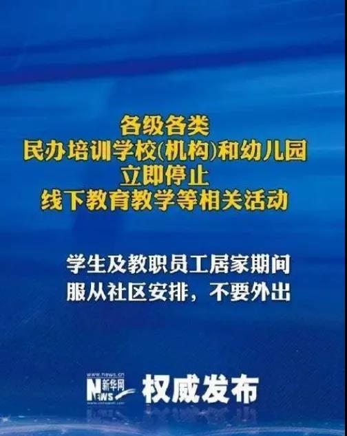 1、各級(jí)各類民辦培訓(xùn)學(xué)校(機(jī)構(gòu))和幼兒園立即停止線下教育教學(xué)等相關(guān)活動(dòng)。