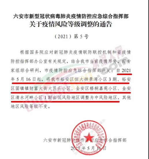 5月16日,安徽省六安市新型冠狀病毒肺炎疫情防控應(yīng)急綜合指揮部發(fā)布《關(guān)于疫情風(fēng)險(xiǎn)等級(jí)調(diào)整的通告》稱,根據(jù)國(guó)務(wù)院應(yīng)對(duì)新冠肺炎疫情聯(lián)防聯(lián)控機(jī)制和省疫情防控指揮部辦公室有關(guān)規(guī)定,結(jié)合六安市當(dāng)前疫情形勢(shì),經(jīng)專家組綜合研判,市疫情防控應(yīng)急綜合指揮部決定∶自 2021年5月16日起,將六安市裕安區(qū)恒大御景灣小區(qū)3期、裕安區(qū)固鎮(zhèn)鎮(zhèn)財(cái)富大街大艮頭小區(qū)、金安區(qū)梧桐嘉苑小區(qū)、金安區(qū)清水河畔小區(qū)1期由低風(fēng)險(xiǎn)地區(qū)調(diào)整為中風(fēng)險(xiǎn)地區(qū),其他地區(qū)風(fēng)險(xiǎn)等級(jí)不變。