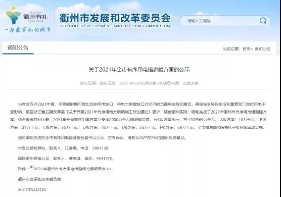 浙江省衢州市發(fā)展改革委發(fā)布《關(guān)于開展2021年有序用電方案編制工作的通知》稱,2021年全省有序用電方案共安排2000萬千瓦錯(cuò)避峰負(fù)荷,分6級(jí)方案執(zhí)行,其中衢州市69萬千瓦。A級(jí)方案:10萬千瓦, B級(jí)方案:21萬千瓦, C級(jí)方案:35萬千瓦, D級(jí)方案:45萬千瓦,E級(jí)方案:55萬千瓦,F(xiàn)級(jí)方案:69萬千瓦,全市錯(cuò)避峰預(yù)案按A-F級(jí)分級(jí)啟動(dòng)實(shí)施。